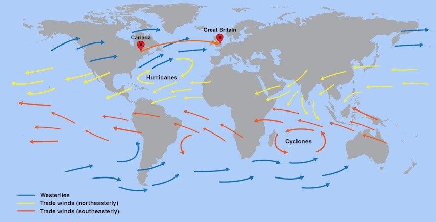 One example of the effectiveness of this concept is the journey taken in 1930 by the British airship R100 to Montreal, Canada, in which, on the return leg back to Great Britain, she took advantage of the Gulf Stream and was able to reduce her travel time by 21 hours.
