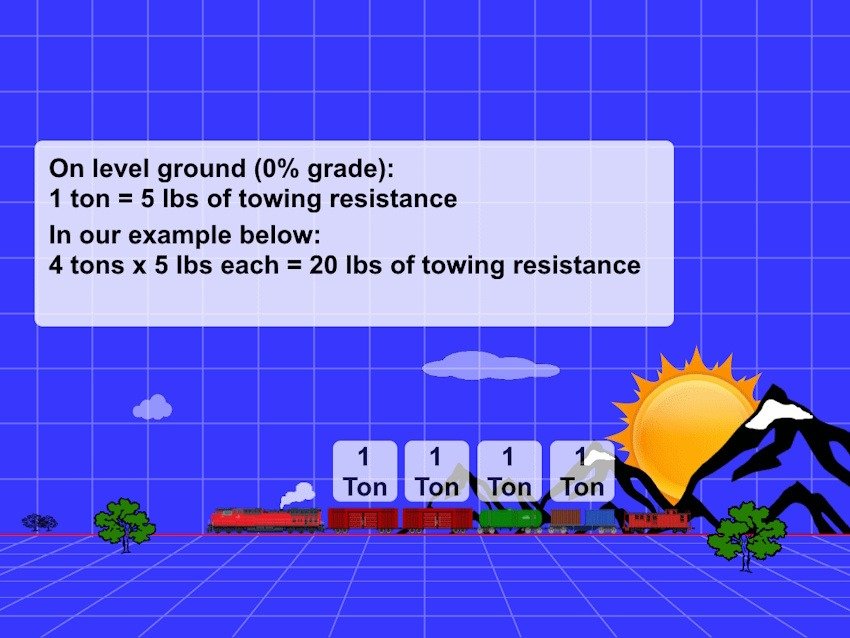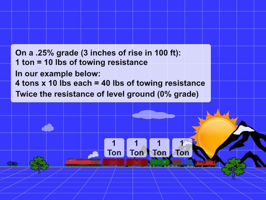 However, as displayed in the following image, if the track elevation is increased to a .25% grade, otherwise known as a “quarter percent grade”, the towing resistance doubles to 10 pounds per 2,000 pounds of load.