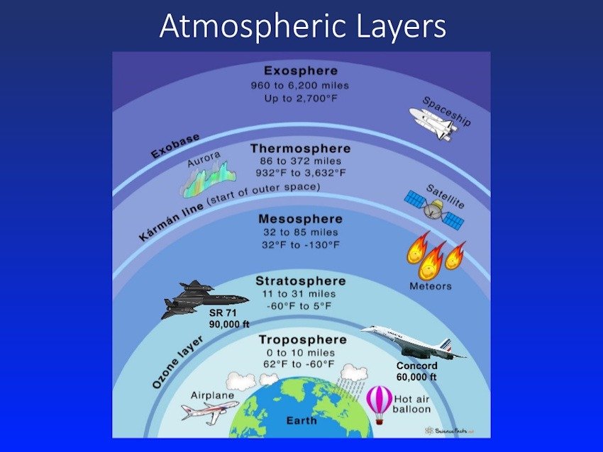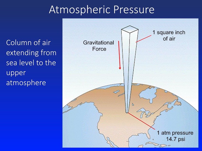 In the image below, the air pressure at the top of the atmosphere is minuscule, but at sea level it increases to 14.7 pounds per square inch, which means there are 14.7 pounds of air pressing down on each square inch of the earth’s surface.