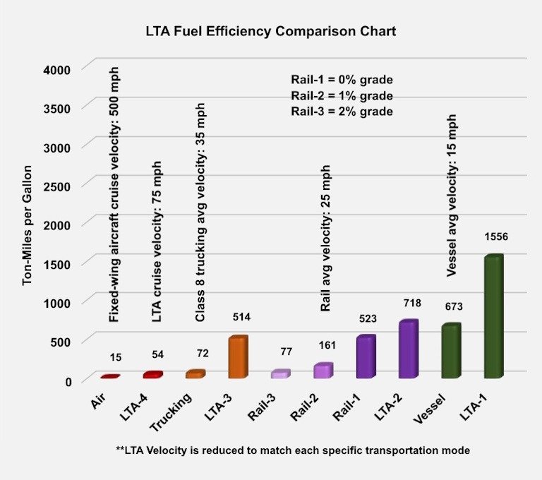 The chart above is a fuel efficiency comparison between Lighter-than-Air technology, also known as LTA, and 4 of the most common modes of transportation today.