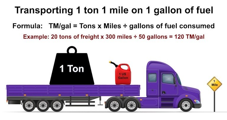 The metric used to measure fuel efficiency within the cargo industry is the “ton-mile per gallon” (TM/gal). It indicates the cargo in tons that can be transported 1 mile on 1 gallon of fuel. The higher the number, the greater the fuel efficiency.