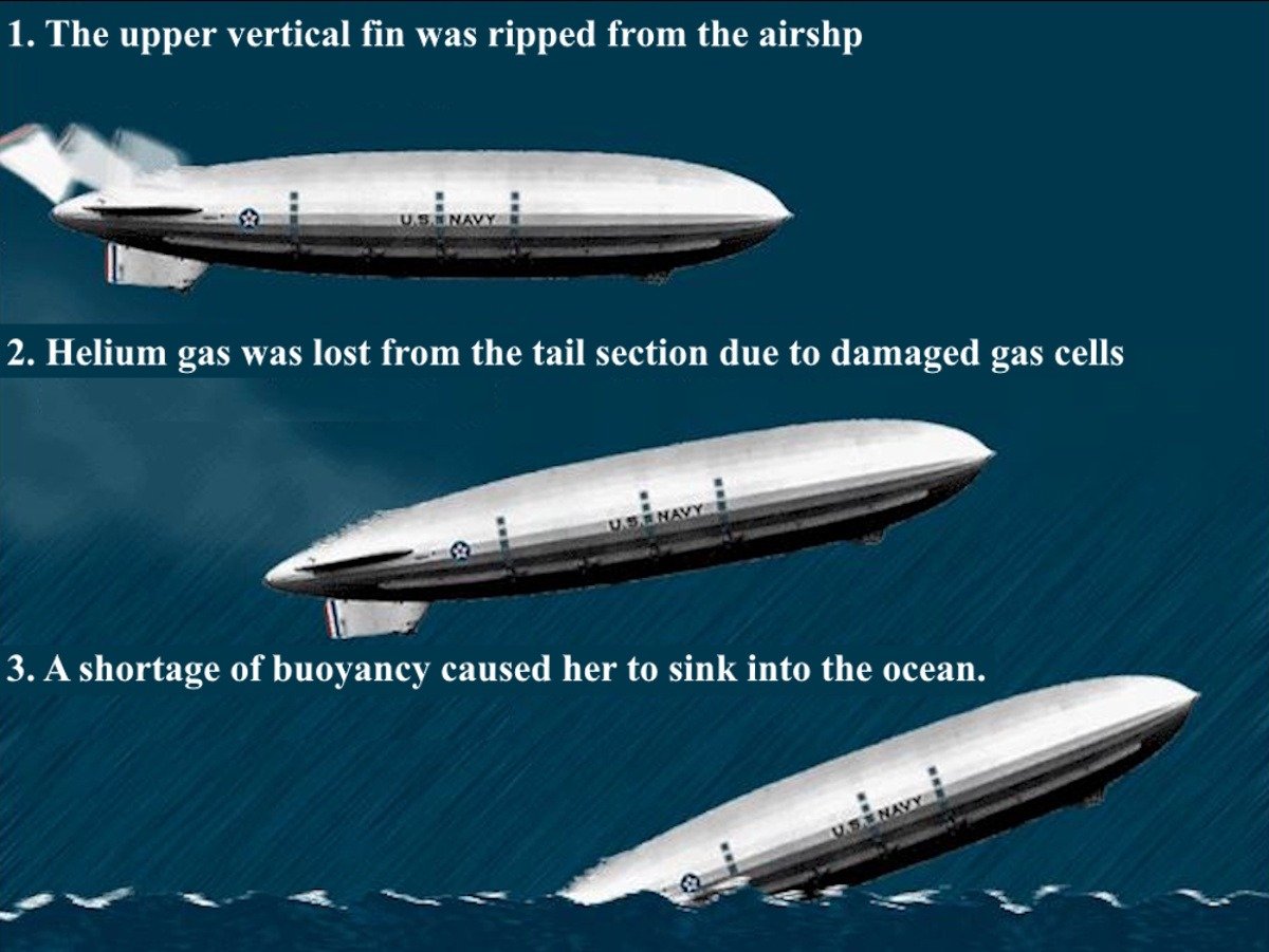 While passing through a moderate thunderstorm, her top vertical fin was ripped away, damaging the gas cells in the tail section of the airship and causing her to crash into the icy waters of the Atlantic.